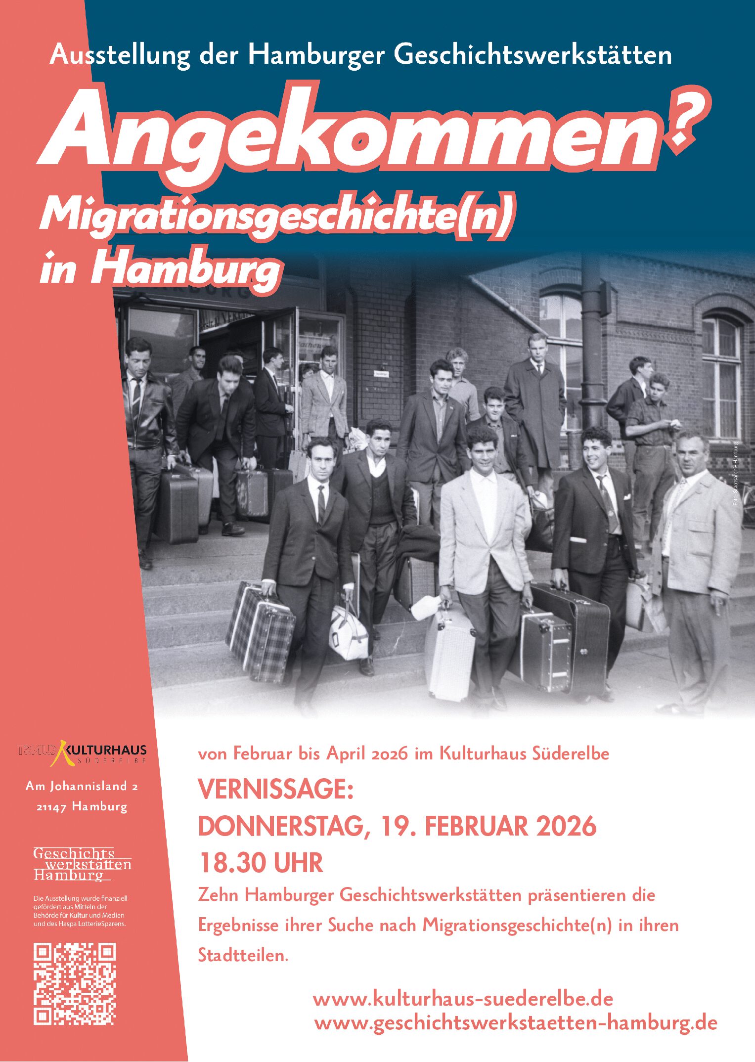 Am Donnerstag, 19. Februar 2026, 18:30 Uhr, wird im Kulturhaus Süderelbe, Am Johannisland 2, die Gemeinschaftsausstellung der Hamburger Geschichtswerkstätten „Angekommen. Migrationsgeschichte(n) in Hamburg“ eröffnet. Gezeigt wird sie bis April 2026. Alle sind herzlich eingeladen, bei Snacks und Getränken miteinander ins Gespräch zu kommen.